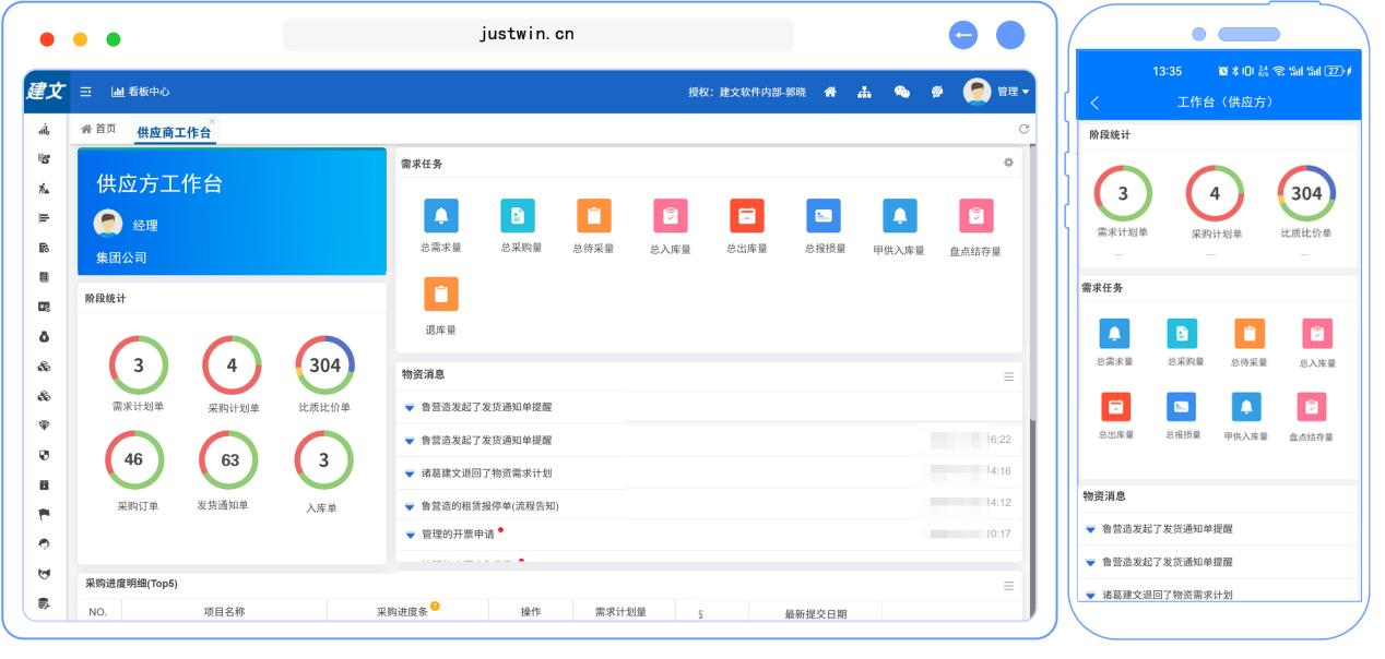供应商协作:对于供应商,业主方通过平台对其材料供应、设备租赁等进行全程监督与管理,确保物资及时、优质供应,维持项目物资链条稳定。
