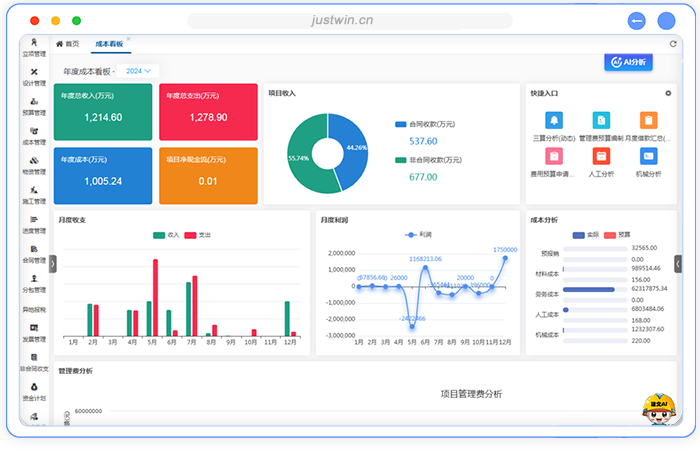 三算分析(施工版):聚焦合同预算、目标成本与实际成本的核心对比,快速定位成本超支或节约的关键环节,实时跟踪企业动态利润、项目利润和目标利润,评估成本管控有效性,驱动施工方案优化与资源动态调配。